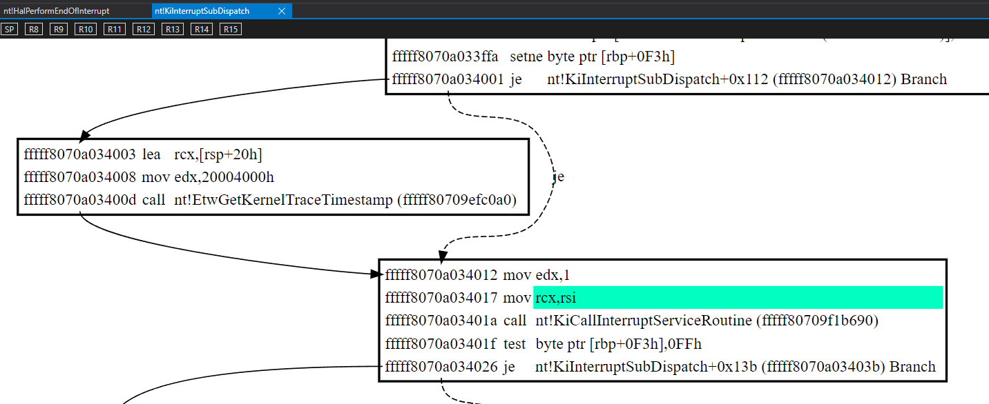 Inspecting entry point from dxgkrnl to our driver dxgkrnl!DpiFdoMessageInterruptRoutine . (dxgkrnl!DpiFdoLineInterruptRoutine just zeroes the MessageNumber parameter and calls dxgkrnl!DpiFdoMessageInterruptRoutine)