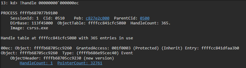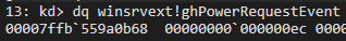 The object in question is winsrvext!ghPowerRequestEvent . This is a handle, so we need to find the actual kernel object behind it.