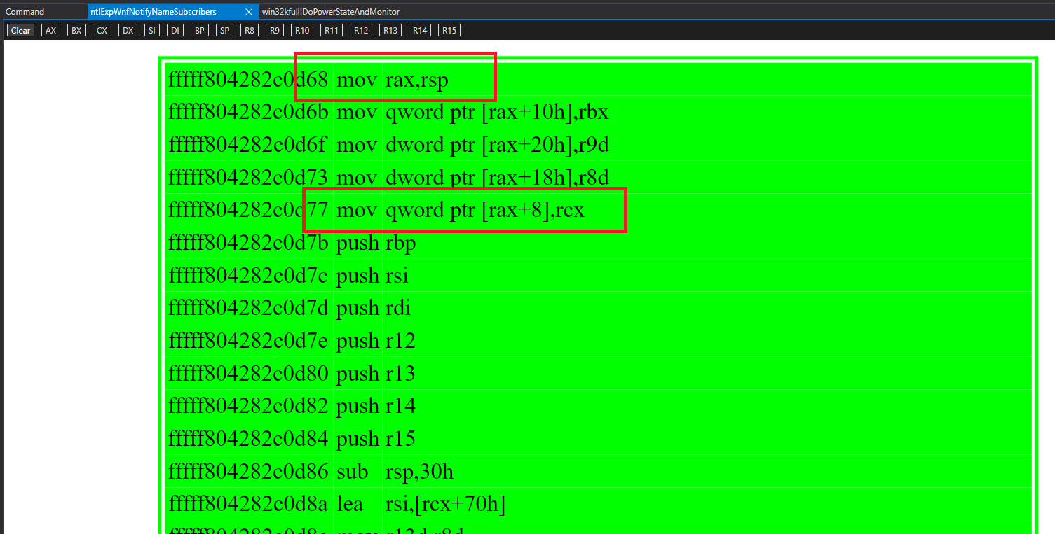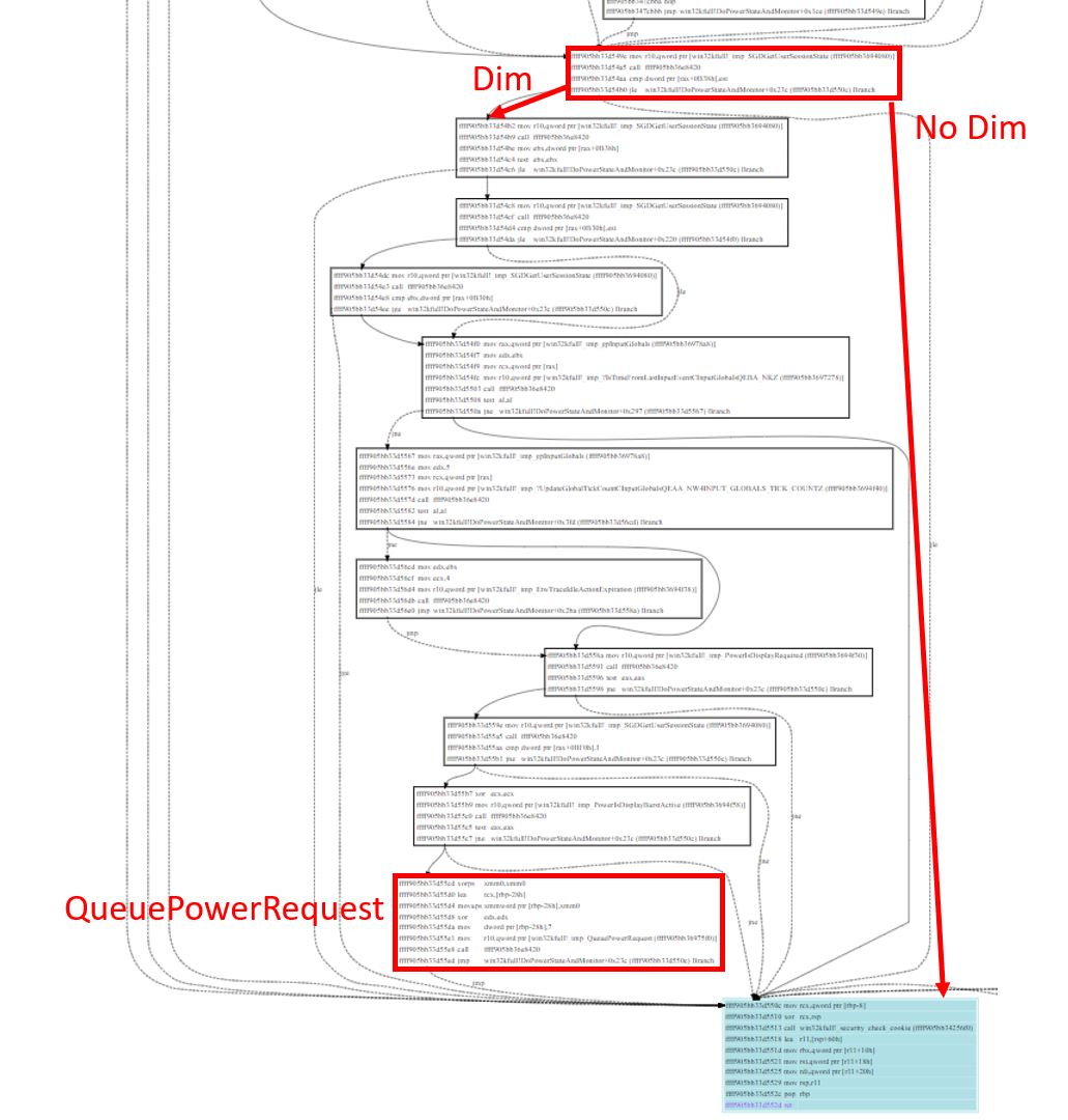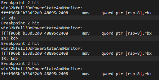 The win32kfull!DoPowerStateAndMonitor is very large and contains several branches. Let’s try to break on that routine.